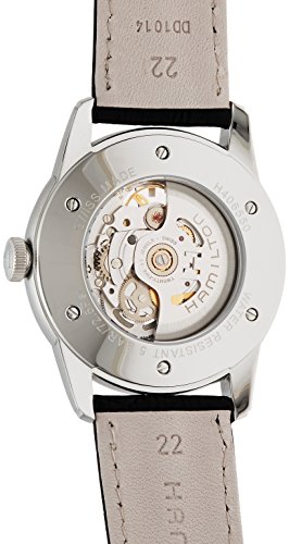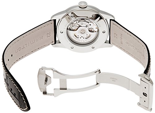Studio : Hamilton Publisher : Hamilton Binding : Watch Product Description Stainless steel case with a black leather strap. Fixed stainless steel bezel. Silver skeleton dial with grey hands and Arabic numeral hour markers. Minute markers around the outer rim. Dial Type: Analog. Automatic movement. H-10-s engine. Scratch resistant sapphire crystal. Pull / push crown. Skeleton case back. Case diameter: 42 mm. Case thickness: 10 mm. Round case shape. Band width: 22 mm. Tang clasp. Water resistant at 50 meters / 165 feet. Functions: hour, minute, second. Luxury watch style. Watch label: Swiss Made. Hamilton Railroad Silver Skeleton Dial Black Leather Mens Watch H40655751. 0