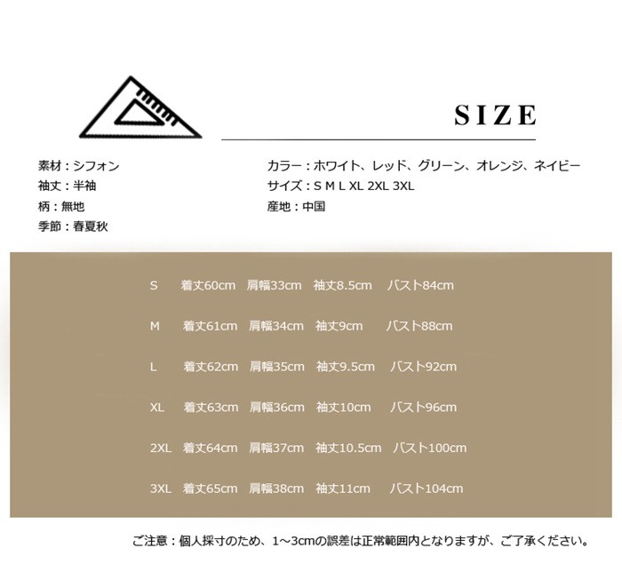 ブラウス レディース シフォンブラウス オフィス トップス 白ブラウス ゆったり 大きいサイズ 無地 カジュアル 2018春夏新作 シフォンブラウス レディース オフィス トップス 大きめ商品詳細素材:シフォン袖丈:半袖柄:無地季節:春夏秋カラー:ホワイト、レッド、グリーン、オレンジ、ネイビーサイズ:S M L XL 2XL 3XL産地:中国サイズ参照表S 着丈60cm 肩幅33cm 袖丈8.5cm バスト84cmM 着丈61cm 肩幅34cm 袖丈9cm バスト88cmL 着丈62cm 肩幅35cm 袖丈9.5cm バスト92cmXL 着丈63cm 肩幅36cm 袖丈10cm バスト96cm2XL 着丈64cm 肩幅37cm 袖丈10.5cm バスト100cm3XL 着丈65cm 肩幅38cm 袖丈11cm バスト104cmご注意:個人採寸のため、1~3cmの誤差は正常範囲内となりますが、ご了承ください。ブラウス レディース シフォンブラウス オフィス トップス 白ブラウス ゆったり 大きいサイズ 無地 カジュアル 2018春夏新作 シフォンブラウス レディース オフィス トップス 大きめ