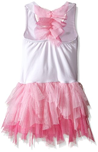 This charming dress has everything going for it - eye catching three dimensional flowers with embroidered stems, a fluffy pink netting skirt and a sporty racer back with ruffle trim.