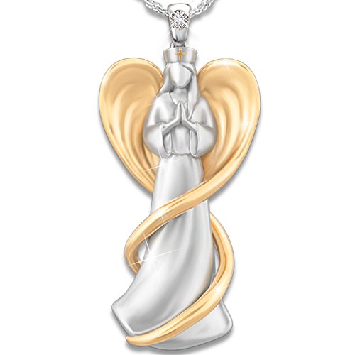 -. Binding : Jewelry -. Brand : Bradford Exchange -. Department : womens -. EAN : 0709792222163 -. Feature : Celebrate the love of a nurse with the sparkling Love of an Angel Diamond Pendant Necklace, a fine jewelry design exclusively from The Bradford Exchange / This meaningful nurse pendant necklace is finely handcrafted and lavishly plated in sterling silver with 18K gold-plated accents / Features gleaming heart-shaped wings which wrap around and embrace an angelic nurse, a design that resembles the Caduceus symbol for healthcare professionals / Atop the angel, a sparkling genuine diamond beautifully sits at the center of the bail / Arrives in a velvet jeweler's pouch and gift box along with a meaningful p card expressing a nurse's love, compassion and kindness -. Label : The Bradford Exchange -. Manufacturer : The Bradford Exchange -. Model : 118342001 -. MPN : 118342001 -. PartNumber : 118342001 -. ProductGroup : Jewelry -. ProductTypeName : FASHIONNECKLACEBRACELETANKLET -. Publisher : The Bradford Exchange -. Studio : The Bradford Exchange -. Title : Necklace: Nurse's Loving Compassion - Love Of An Angel Pendant Necklace by The Bradford Exchange -. UPC : 709792222163