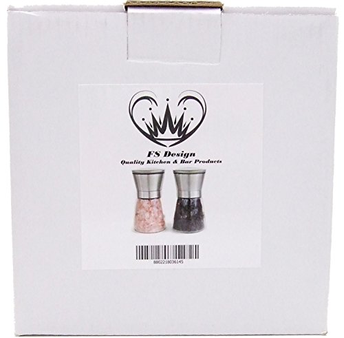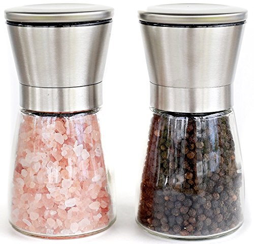 Salt and Pepper Grinder Set - Stainless and Glass Design, Infinitely Adjustable Ceramic Burrs, 5.25" tall/ 3" dia, Easy Separation for Filling