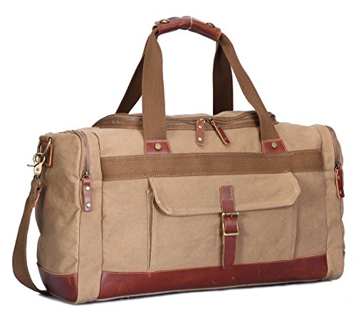 -. Feature : Size of this vintage overnight bag: 19"/7.9"/13"(48*20*33cm)(L*W*H);Weight: 1.1KG; Capacity: 32L. This size can be a carry on travel bag under seat and has lots of room for a 2-3 days trip / Material of this Weekend bag: this canvas leather duffel bag is made of high quality soft canvas, decorated by top quality genuine leather. It is nice sturdy overnight bag that had leather in the design makes the bag fashion, classic and casual. Please do not put the bag exposed to the sun for a long time. Since the leather is genuine which would be mold if the air is wet, please put the bag in the dry and ventilated place after using / Comfortable and multiple pockets: the handle with soft genuine leather and long durable shoulder strap which is comfortable as a carry on handbag or shoulder bag. And there are 9 pockets that you can manage to get things inside and keep your things organized / Solid metalwork: this duffle bag has quality double zipper opening for easy access and the leather zipper pullers are large and made well, good quality hooks makes it easy to transport from shoulder to hands with comfort and sturdy grips / This canvas leather bag is unisex classic style perfect for men and women for gym, weekend travel, daily travel, short business travel while flying, on the train, on the bus to hold all of your luggage. It is a great gift for your friends and families
