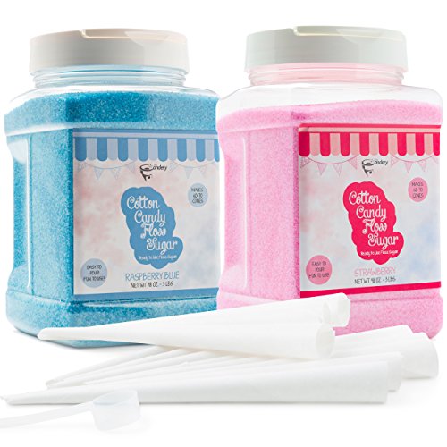 - • Easy to Pour, Scoop & Enjoy – INCLUDES 100 Premium Cones, Along with an easy-pour spout, each 48 oz. floss sugar jar comes with a scoop to make it easier to pour the floss into a cotton candy maker.