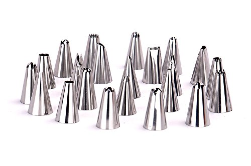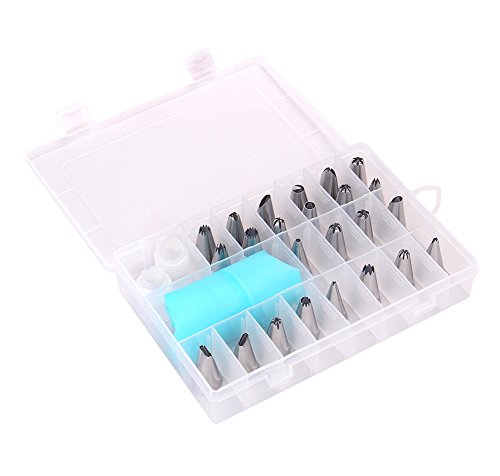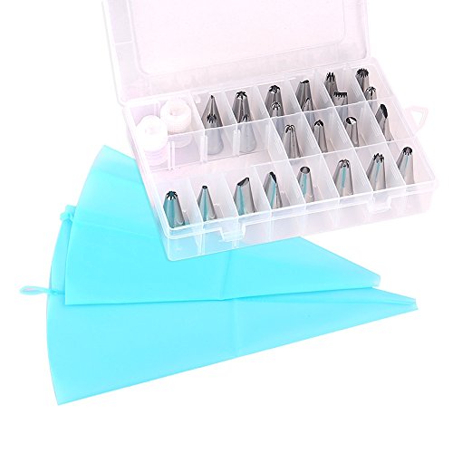 - Patterns:24 stainless steel tips and 2 Reusable Coupler Storage Case 2 Reusable Silicone pastry bags help you creat all types of patterns on cake.