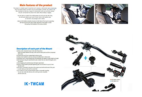 -. Binding : Electronics -. Brand : Top Mount -. Color : Black -. Feature : 1. Compared to the method of fixing one headrest post, even a heavy devices are well fitted without deflection by both headrest poles fixing. / 2.Expansion and reduction of length : Possible to enlarge or reduce the length up to 84cm at least 40cm. Can be mounted from small racing car to van / 3. Adjust angle and position : The round center axis can be moved left and right. It can be adjusted up and down by rotating it loosely. 1/4-inch thread Ball head can be rotated 360 degrees to rotate. / 4. Flexible angles and length adjustments on both sides of the mount frame make it possible to fix the mount from small cars to even large . / 5. This product is suitable for use in racing vehicles, during driving in a car, for driving recorders, etc. -. Label : Inter Trade -. Manufacturer : Inter Trade -. Model : IK-TWCAM -. MPN : TWO-WAY-CAM -. PackageQuantity : 1 -. PartNumber : TWO-WAY-CAM -. ProductGroup : PC Accessory -. ProductTypeName : COMPUTER_ADD_ON -. Publisher : Inter Trade -. Studio : Inter Trade -. Title : a bar type headrest mount fix on both headrests for mounting camcorder action cam camera mount with all metal sturdy pipe added both side flexible part and 1/4 inches thread as a cam connecting part