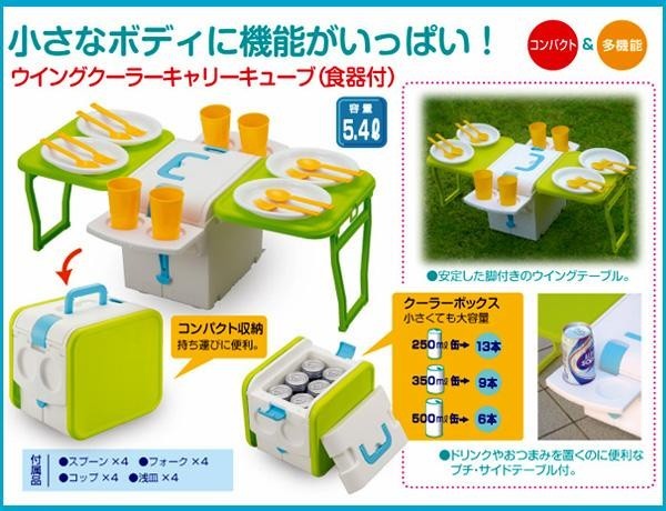 | キューブタイプのコンパクトなテーブル付きクーラーボックスです。クーラーボックスは、小さくても大容量の5.4リットル!!ピクニックに、キャンプに、運動会に、海に、用途に合わせて大活躍☆便利な食器が付いて、ウキウキパーティ気分♪ |