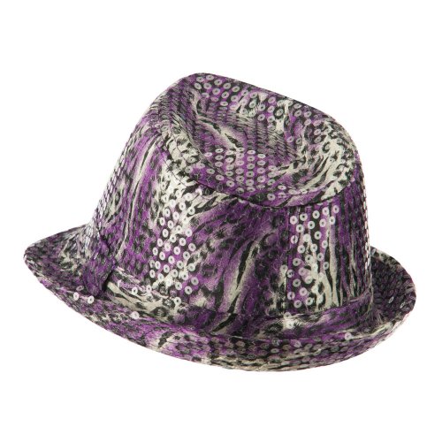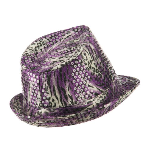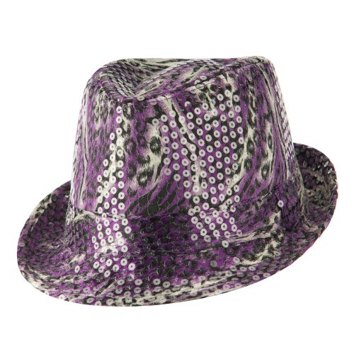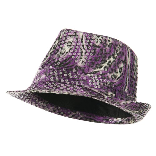 Binding : Apparel Product Description Animal print designed fedora features sequins all over for ladies. Crown is accented with a matching hat band. Crown features tear drop shaped top. Front brim is downturned and back brim is upturned. Our designed fedora is great for any outdoor and indoor event in all the seasons. All Season. Soft, thin and lightweight material. 9(W) X 10(L) X 4 1/2(H) inches. Available in different colors and styles. 0