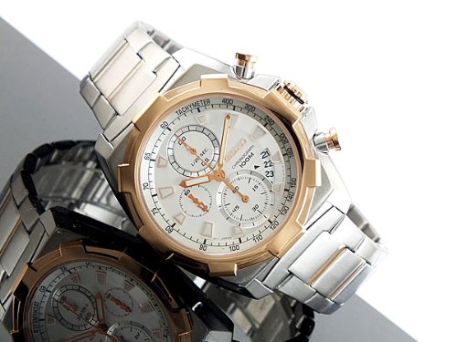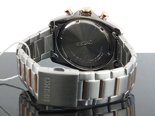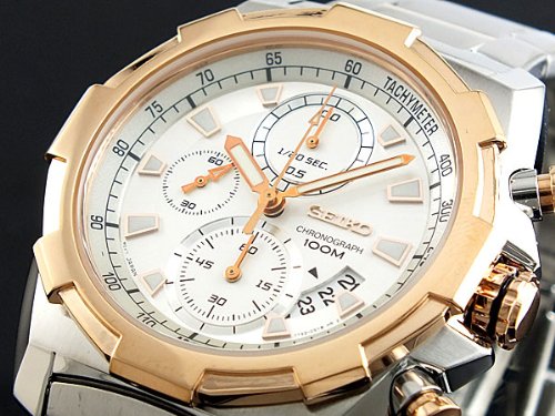 Two tone rose gold stainless steel case and link bracelet with fold over deployment clasp. Silver tone dial with luminous rose gold tone hands. 12h chronograph measures in 1/20sec increments. Date display. Precise Quartz movement. Scratch resistant Hardlex crystal. Water resistant to 100m. Case measures 45mm diameter by 12mm thick.