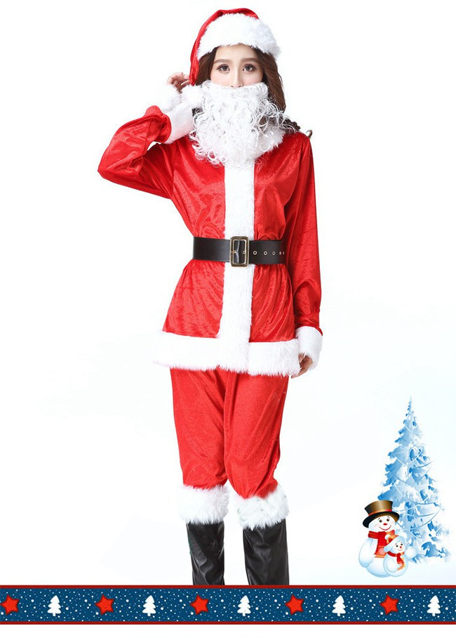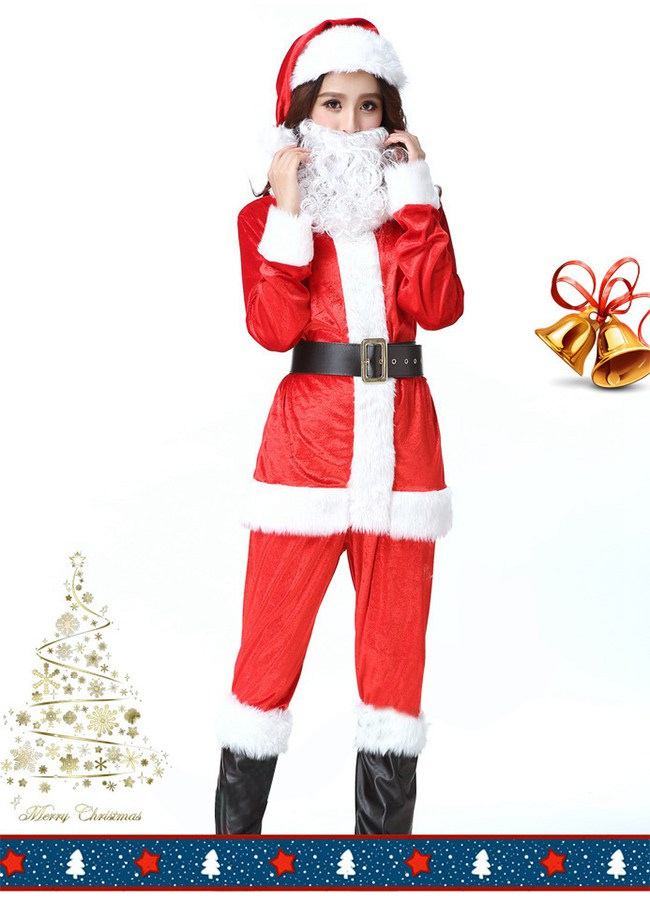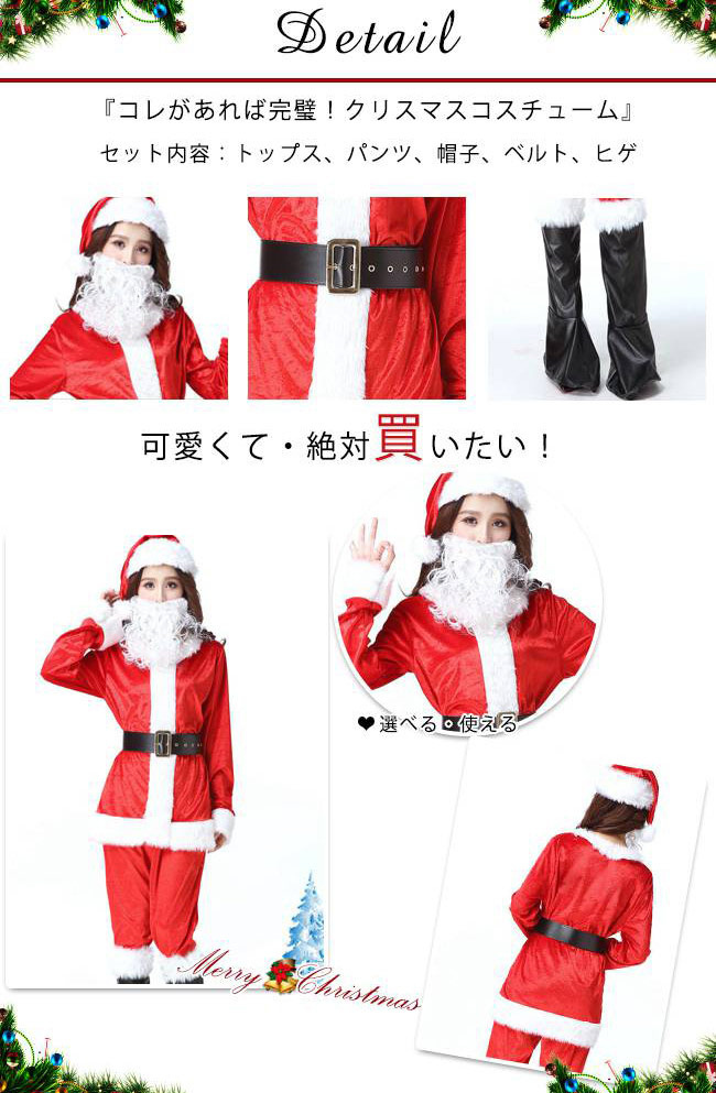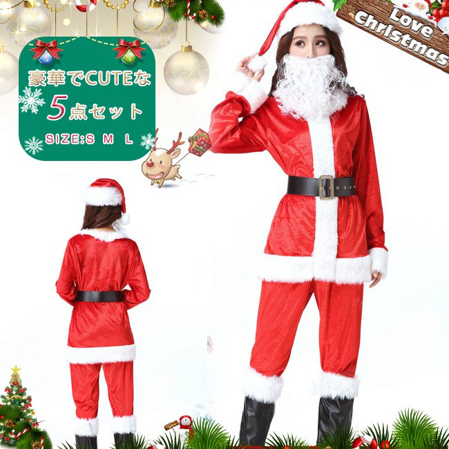 サンタ コスプレ レディース クリスマス 衣装 長袖 上下セット 帽子 髭 コスチューム サンタクロース 仮装 変装 大人 服 セットアップ サンタコス パーティーグッズ イベント用品 余興 xmas Christmas cos 女性用