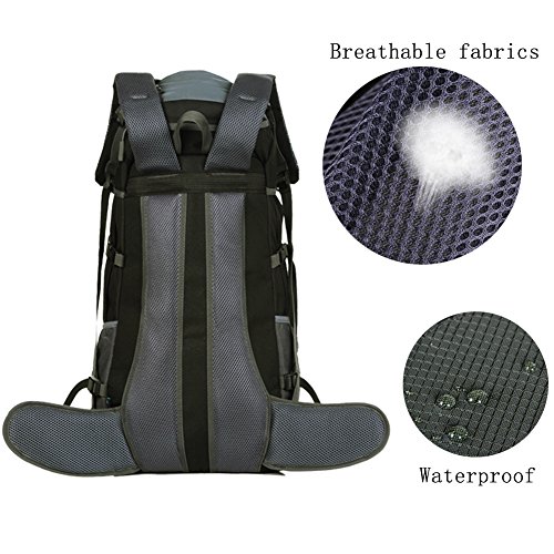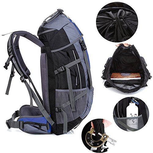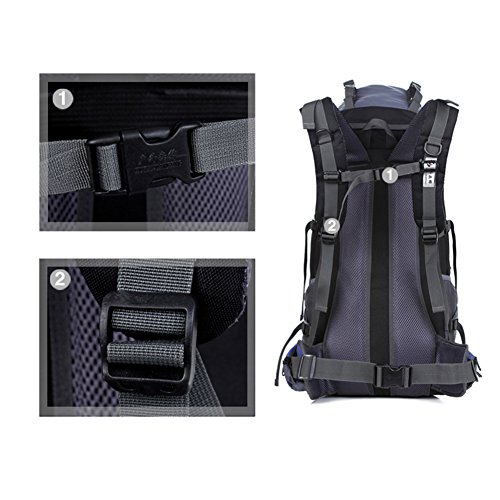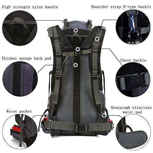 -. Feature : 【Multiple pockets】: 1 main compartment(with drawstring closure and fold-over lid.), 2 zipped front pocket, 2 mesh pockets,2 waist pocket, 2 front pockets, 2 mesh pockets,main compartment with separate room for your items organized, such as tent, roll up blanket, cooking gear, etc. / 【Adjustable straps】: 8 adjustable straps, you can adjust the length of the backpack strap at will, this climbing backpack almost suit for all people. / 【High quanlity material】: Made of ultralight water-resistant and tear resistant nylon fabric, very durable. Waterproof coating fabric, keep your item dry , without worry in rainy day, which are good for Climbing, Camping, Hiking Traveling etc. / 【Comfortable】: Breathable mesh shoulder straps with plentiful sponge padding help relieve the stress from your shoulder. Molded foam back panel with airflow channels to keep your back cool and dry. / 【After-sales guarantee】: Please do not hesitan to contact us if you have any questions. We will reply you within 24 hours and offer you our best services.