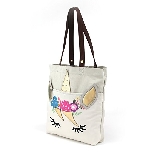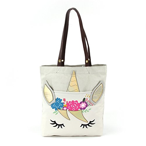 Floral Unicorn Applique 14.5 x 16 Inch Canvas Shoulder Tote Bag