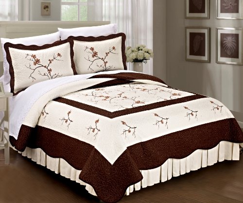 Serenta Classic Embroidered 100% Cotton Bedspread Quilt Blanket 3 Piece Bed Set, King, Brown Cherry Blossom