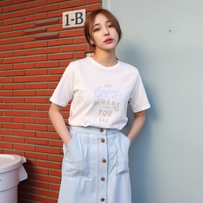 컬러마다 다른 색감의 레터링이 매력적인 반팔 티입니다. 귀여운 무드의 레터링이 상큼한 느낌을 주는데요. 적당한 품이라 핏감이 예쁘고 너무 붙는 스타일은 아니라 편하게 착용되구요. 스커트나 팬츠 등 활용도 높게 스타일링하기 좋은 아이템이랍니다. 모델처럼 스커트와 매치해 귀여운 느낌으로 연출해 주셔도 좋을거 같아요. 전체적으로 살짝 비침이 있어 비침에 민감하신 분들은 이너웨어 착용하는 걸 권장 드려요.
