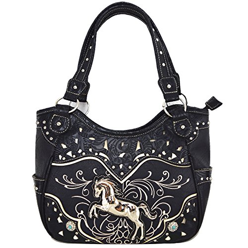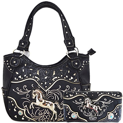 Western Style Horse Cowgirl Laser Cut Handbags Women Tooled Leather Totes Country Purses Wallet Set Black