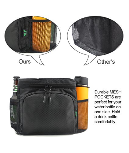 Zippered FRONT POCKET /Dual side MESH POCKETS: side mesh pocket can hold LARGE bottle and front pocket can keep small things like bars, silverware, wipes, sugar packs.