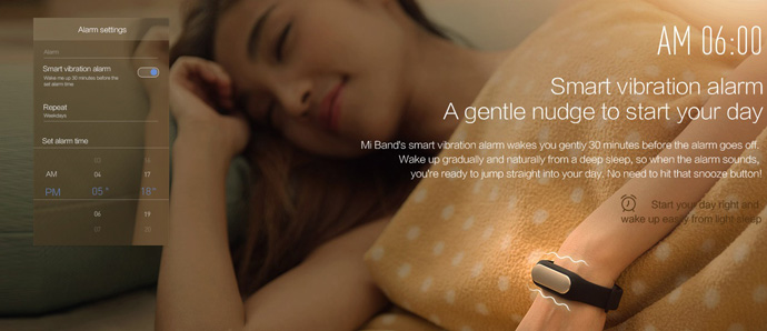 Cerdas getaran alarm Mi Band bangun Anda lembut 30 menit sebelum alarm alarm berbunyi. Bangun secara bertahap dan alami dari tidur nyenyak, jadi ketika alarm berbunyi, Anda siap untuk melompat langsung ke hari Anda. Tidak perlu untuk mukul tunda yang tombol!