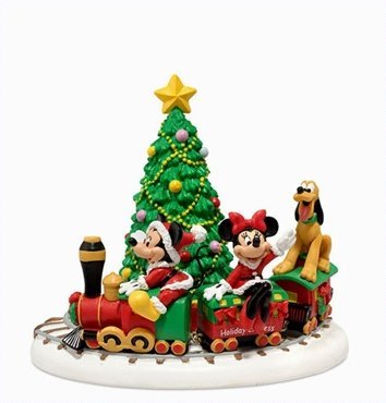 Mickey and Minnie try out the nephews new train to be sure all is in working order for Christmas Morning Hand painted and handcrafted from skilled artisan and inspired by the genius of Walt Disney.