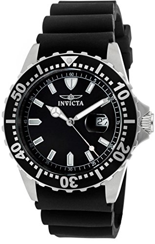 Elegance meets dependability and sport performance in Automatic Watch #9110 from the Invicta Men's Pro Diver Collection. This timepiece features a black dial with a combination of dot, stick, and triangular indices, a convenient date display at three o'clock, and a trio of luminous hands, along with small stick indices marking each minute on an outer dial. Also showcasing a stainless steel unidirectional bezel with a black finish and bold indicators, including Arabic numerals at the 20, 30, 40, and 50 minute marks, this watch employs an antireflective mineral crystal to protect its face, and it utilizes Japanese automatic movement for extreme precision. It is held in place by a sleek, black rubber band with a buckle clasp, and it is water resistant to 660 feet for true dive functionality.Screw Down Crowns: Many Invicta watches are equipped with a screw down crown to help prevent water infiltration. This is most common on our Diver models. In order to adjust the date and/or time on such a watch, you must first unscrew the crown before you can gently pull it out to its first or second click stop position. To do this, simply rotate the crown counterclockwise until it springs open. When you have finished setting the watch, the crown must then be pushed in and screwed back in tightly. Not doing so will cancel the water resistance of the watch and will void all warranties from the manufacturer. Overall, this process should not require a lot of effort or force.