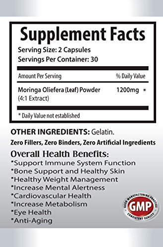 -. Feature : MORINGA OLEIFERA EXTRACT 1200 MG - HISTORY: Moringa is a genus of trees indigenous to Southern India and Northern Africa. It is a short, slender, deciduous, perennial tree that grows about 30 feet tall. Once grown only in India, Africa and the Himalayas, it is now cultivated in Central and South America, Sri Lanka, Malaysia and the Philippines. / MORINGA OLEIFERA EXTRACT 1200 MG: Moringa leaves are known as a fantastic superfood that packs more vitamins, minerals, proteins, amino acids and antioxidants into every serving than any other plant in the world. Moringa leaves contain more antioxidants than any other edible plant. / MORINGA OLEIFERA EXTRACT 1200 MG: Is high in nutrition and full of antioxidants. Moringa Oleifera is used orally and topically in holistic and Ayurvedic medicine to provide various health benefits. / MORINGA OLEIFERA EXTRACT 1200 MG: Moringa oleifera has been praised for its health benefits for thousands of years. It is very rich in healthy antioxidants and bioactive plant compounds. Moringa oleifera is a natural way to boost mood, stay healthy and to lose weight. / OUR GUARANTEE: PREMIUM QUALITY SUPPLEMENT MANUFACTURED IN THE USA! We use only the very best ingredients, all of which are manufactured in state-of-the-art facilities, with strict adherence to good manufacturing practices (GMP). We're very confident that you'll love this product, so we offer a 100% money-back guarantee.