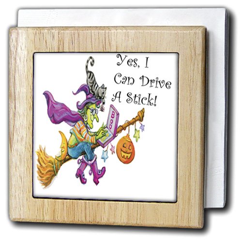 -. Brand : 3dRose -. Feature : Dimensions (in inches): 6 x 6 / Includes 2 - 4" x 4" high gloss ceramic tiles / Made out of solid wood / Tile panels connected by wooden dowels / Some assembly required -. Label : 3dRose LLC -. Manufacturer : 3dRose LLC -. ProductGroup : Kitchen -. ProductTypeName : KITCHEN -. Publisher : 3dRose LLC -. Studio : 3dRose LLC -. Title : 3dRose Anne Marie Baugh - Halloween - Cute Witch Flying Her Groom Says Yes I Can Drive A Stick In Black - Tile Napkin Holders