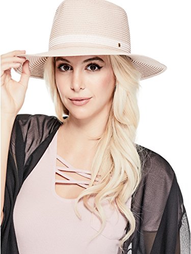 Product DescriptionPerfect for sunny days, this straw fedora features a wide brim and a pastel pink design.0