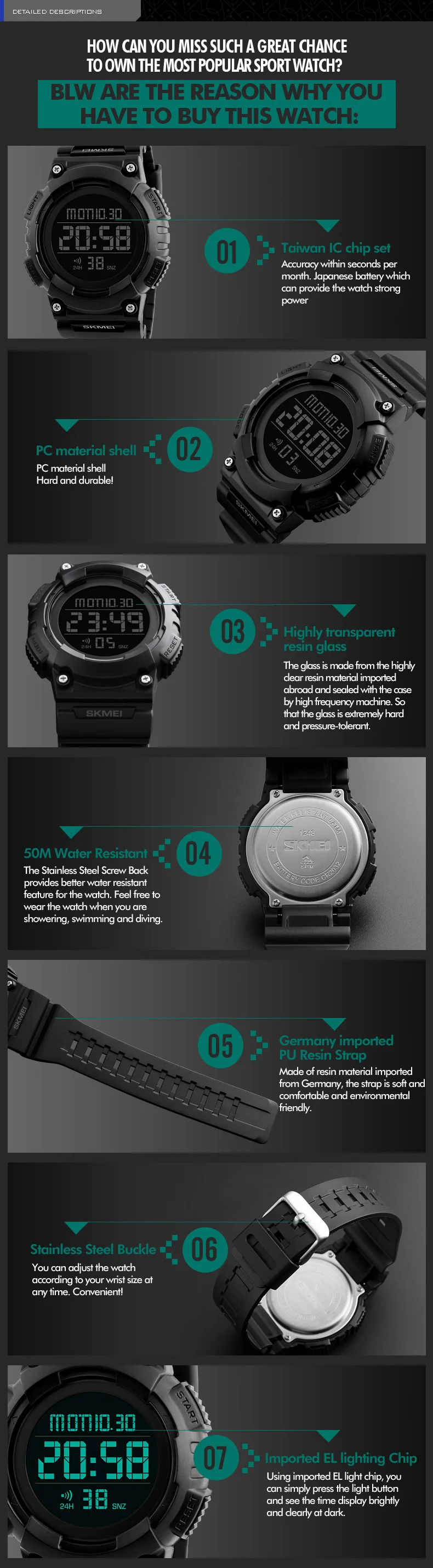 Feature:Alarm,Back Light,Water Resistant,Multiple Time Zone,Chronograph,Shock Resistant,Complete Calendar,Swim,Auto Date,LED display