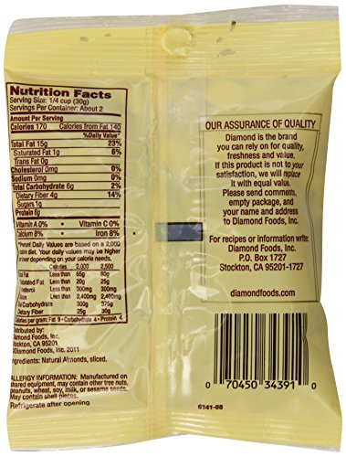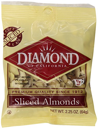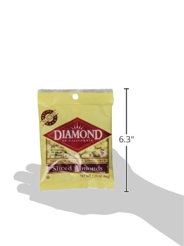 Pack of 12, 2.25-oz bags (1/2 cup) of Diamond of California Sliced Almonds^100% California Grown^Diamond of California has offered fresh, high quality and great tasting nuts for over a 100 years^Unseasoned and ready for baking, cooking, snacking and using as a topping^Kosher Certified