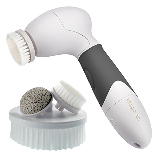 Experience the benefits of an enhanced cleansing and exfoliating routine with the Vitagoods face and body cleansing brush. Use it daily and enjoy skin that is healthier, smoother, and more radiant. A powerful, safe rotary action gently spins the head to thoroughly cleanse, exfoliate, and lift dirt and oil trapped in pores. Gentle and effective, the micro-massage movement of the head stimulates and invigorates the surface of the skin. The brush targets the removal of unwanted particles to improve skin surface. The dedicated exfoliating facial brush penetrates even deeper into the pores to reduce oily areas, tame blemishes, remove dead skin cells, and help smooth dry skin patches. With regular use this unit can help massage away the appearance of visible skin pores and fine lines to reveal younger skin. The Vitagoods face and body cleansing brush is not restricted to the face alone. The unit comes with two brushes to extend the benefits to the rest of your body. Safe to use in the shower or bath, the body brush pampers and polishes your body while the Pumice stone attachment removes hard skin, including callouses on your feet. Portable, powerful and practical, the Vitagoods face and body cleansing brush enhances your skin routine without chemicals or harsh abrasive techniques to leave you with healthier and softer, more beautiful looking skin. Available in white with gray, black, or purple accent.
