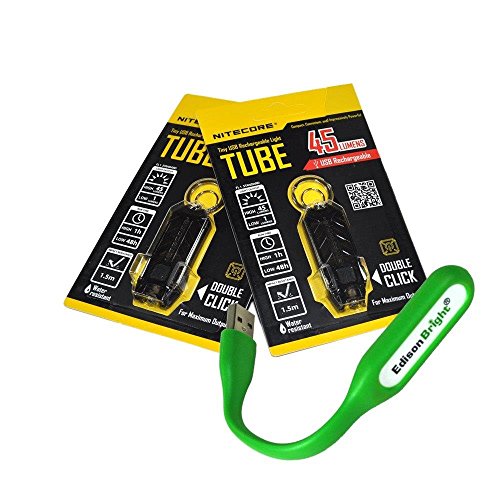 Nitecore TUBE black 2 pack of 45 lumen USB rechargeable keychain light with EdisonBright USB powered flexible reading light bundle