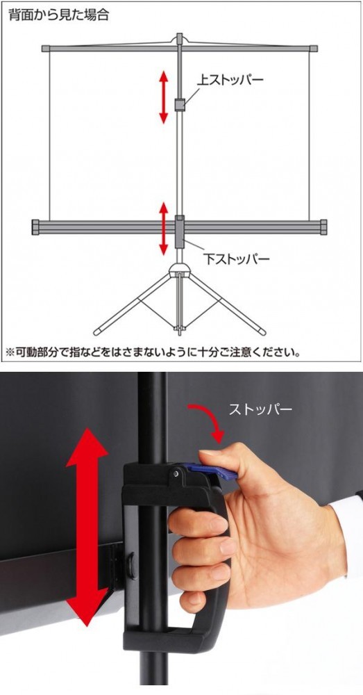 | 三脚一体型のスクリーンで、設置や移動が簡単です。スクリーンの高さや位置を調整でき、傾きも2段階の微調整が可能です。収納時はスクリーンを縦方向に回転させ、コンパクトに収納できます。 |