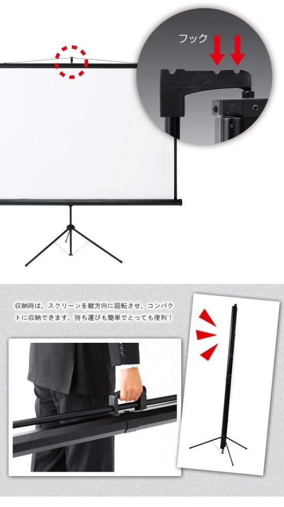 三脚一体型のスクリーンで、設置や移動が簡単です。スクリーンの高さや位置を調整でき、傾きも2段階の微調整が可能です。収納時はスクリーンを縦方向に回転させ、コンパクトに収納できます。 |