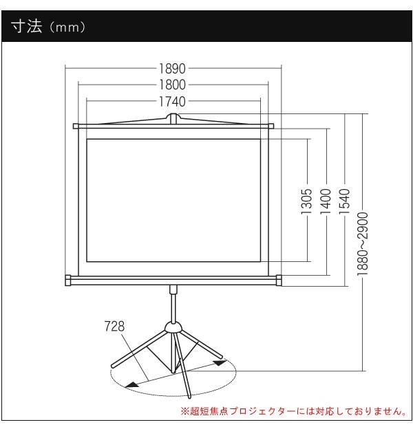 | 仕様 | スクリーン表示サイズ:W1740×H1305mm アスペクト比/4:3 対角線サイズ:85型相当 高さ1880~2900mmの間で調整可能 傾き85度・82度で調節可能 |