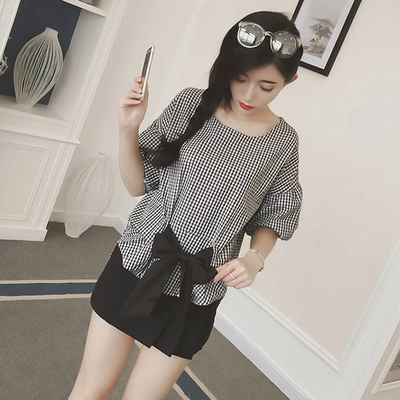 春夏新款韩版百搭休闲显瘦小格子蝴蝶结五分袖套头衬衫衬衣女