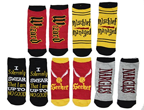 Product Description This 5 pack of Harry Potter socks features thinsg that any Harry Potter fan will know such as Nargles, Snitches and Seekers, and phrases from the Maruaders Map. Great for wizards or Muggle Borns! 0