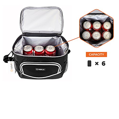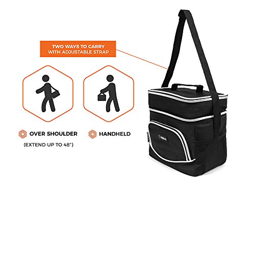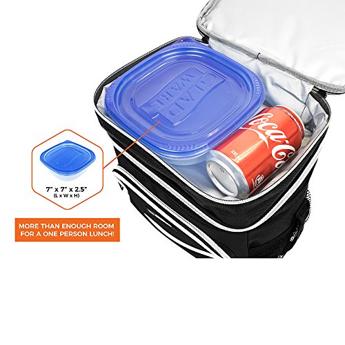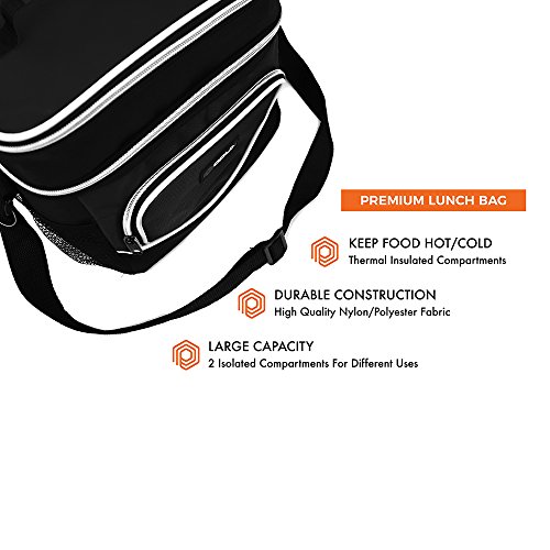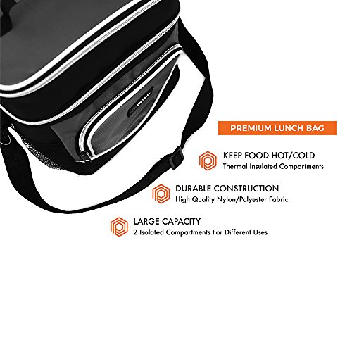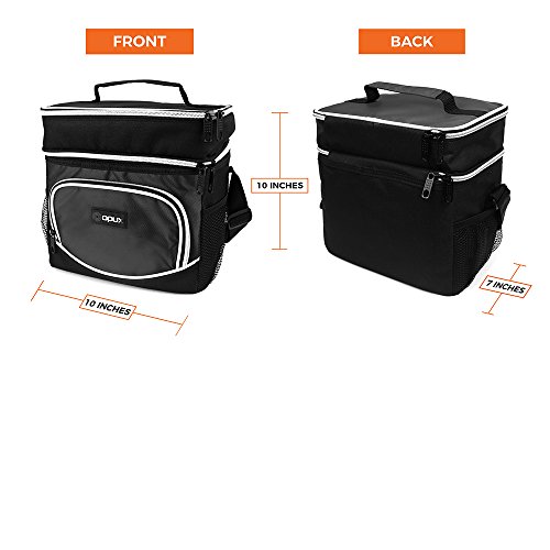 -. Feature : MULTI-USE & CONVENIENT: Great for adult men and women to pack food and drinks for work, school, picnics, beach, road trips, camping, traveling or any outdoor activities. Comes with an adjustable shoulder strap, top handle to easily carry around, and two mesh drink holders for water bottle storage. Our reusable lunch pail is perfect to preserve freshness for those on the go. / SEPARATE HOT AND COLD FOOD - This bag offers different ways of packing your food through its dual compartment zippered design, which allow you to separate hot and cold food/beverages. With this extra space it is also great for ice packs and ice blocks to keep your food extra fresh. / DURABLE AND RIP RESISTANT- Made with high-quality nylon and 600D polyester fabric with reinforced zippers to prevent rips and ensure maximum durability. / LEAKPROOF AND THERMAL INSULATED - Equipped with ECO-friendly PEVA lining That is soft and easy to clean. Just wipe with a wet cloth and it's good as new. Spacious enough to fit an entire six-pack of soda, enough room to for one person's lunch and more! And if that's not enough space, there are side pouches and a front pocket to carry extra items such as utensils and napkins. / SIZE: 10" x 7" x 10" (L x W x H) | Available in 5 colors - Black, Gray, Navy, Red, Green