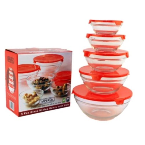 [Product Information]- 5 Pcs glass nesting bowl set with red lids. They are microwave, dishwasher and fridge safe