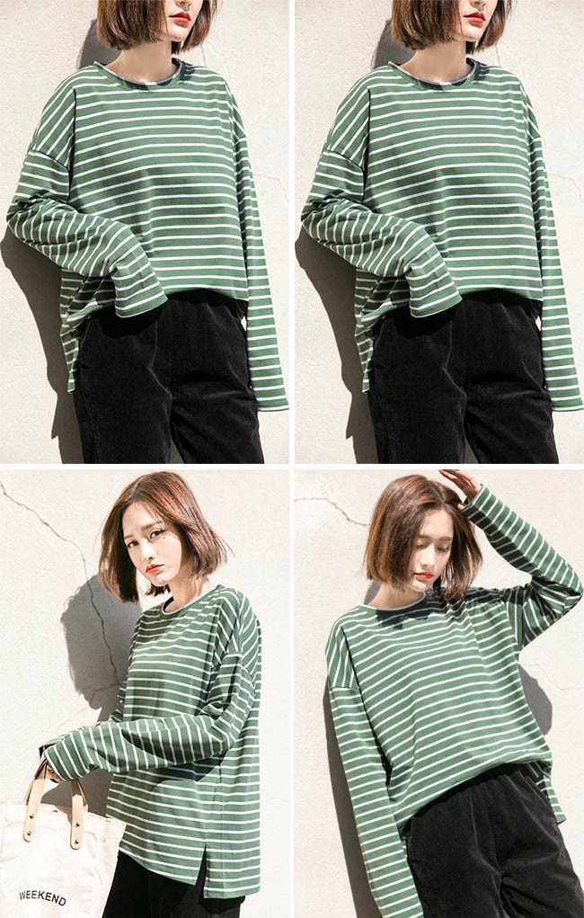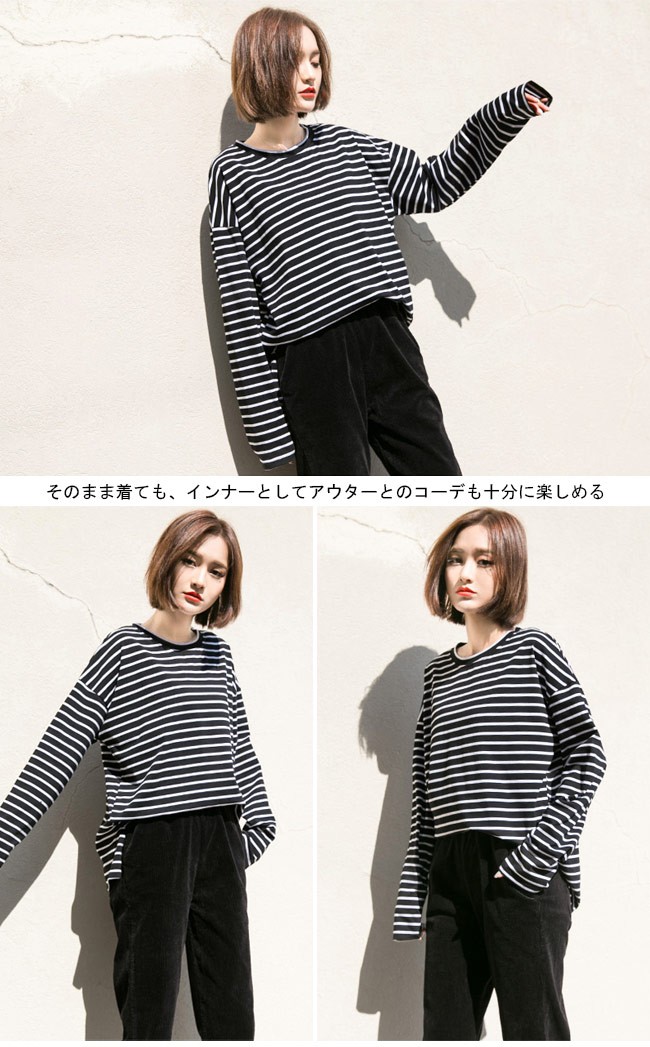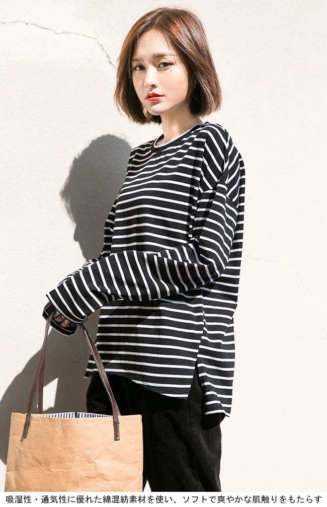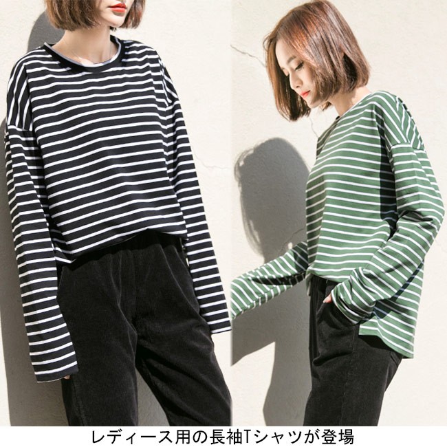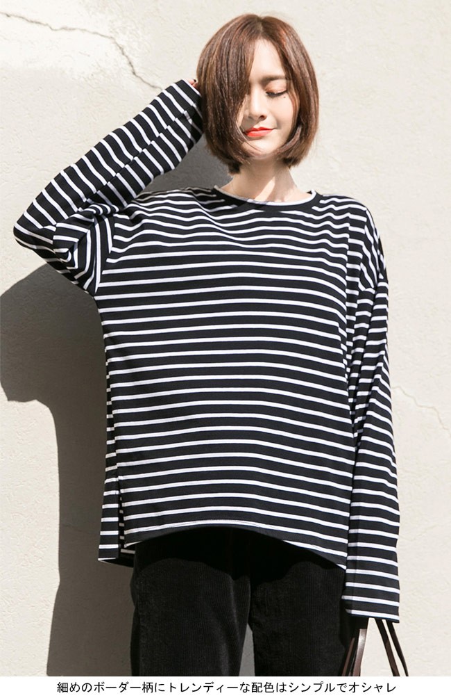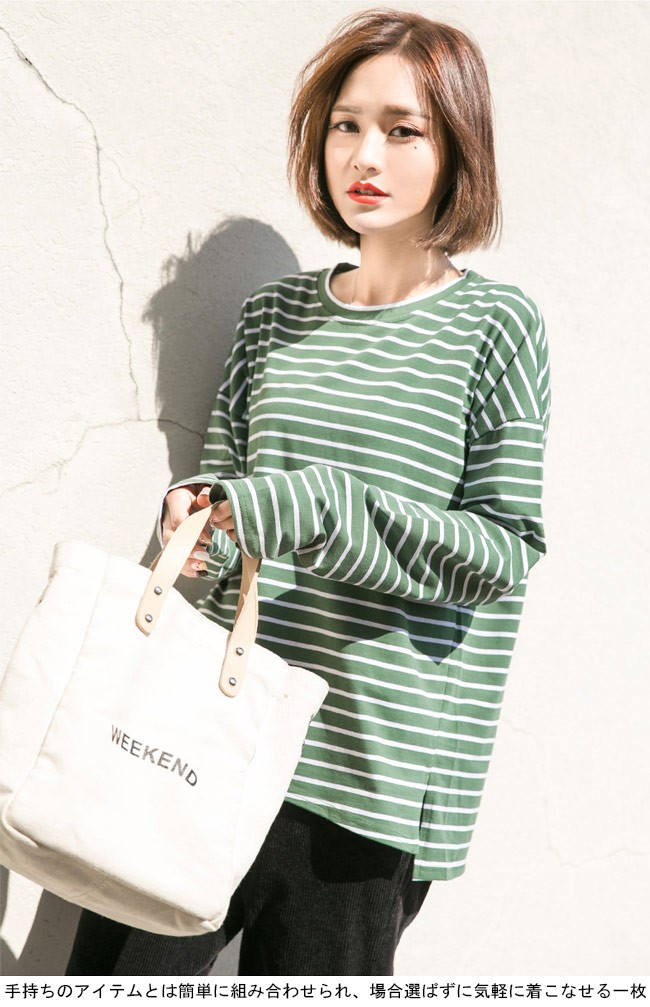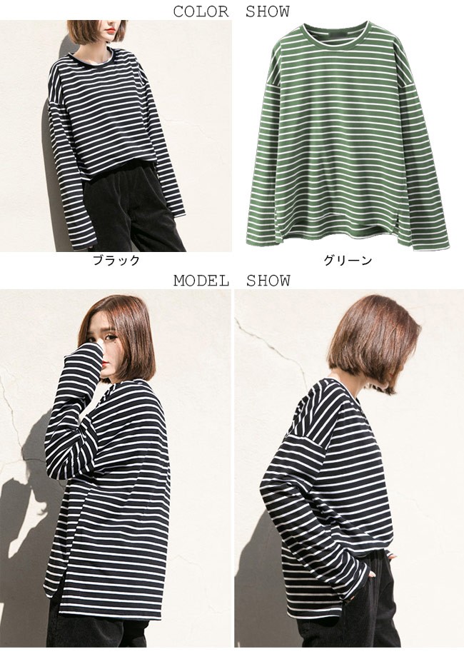 長袖Tシャツ レディース ゆったり Tシャツ ボーダー柄 丸襟 トップス ドロップショルダー カジュアル 体型カバー 女性用 オールシーズンレディース用の長袖Tシャツが登場吸湿性・通気性に優れた綿混紡素材を使い、ソフトで爽やかな肌触りをもたらす細めのボーダー柄にトレンディーな配色はシンプルでオシャレドロップショルダーにゆったりとしたシルエットでカジュアルなオシャレ感を演出そのまま着ても、インナーとしてアウターとのコーデも十分に楽しめる手持ちのアイテムとは簡単に組み合わせられ、場合選ばずに気軽に着こなせる一枚カラー:ブラック グリーン素材 綿混紡サイズ(cm) S M LS 着丈67 バスト106 肩幅58M 着丈68 バスト112 肩幅59L 着丈69 バスト118 肩幅60ご注意:※サイズは平置きサイズです。素人採寸ですので、若干の誤差がございます、ご了承ください。