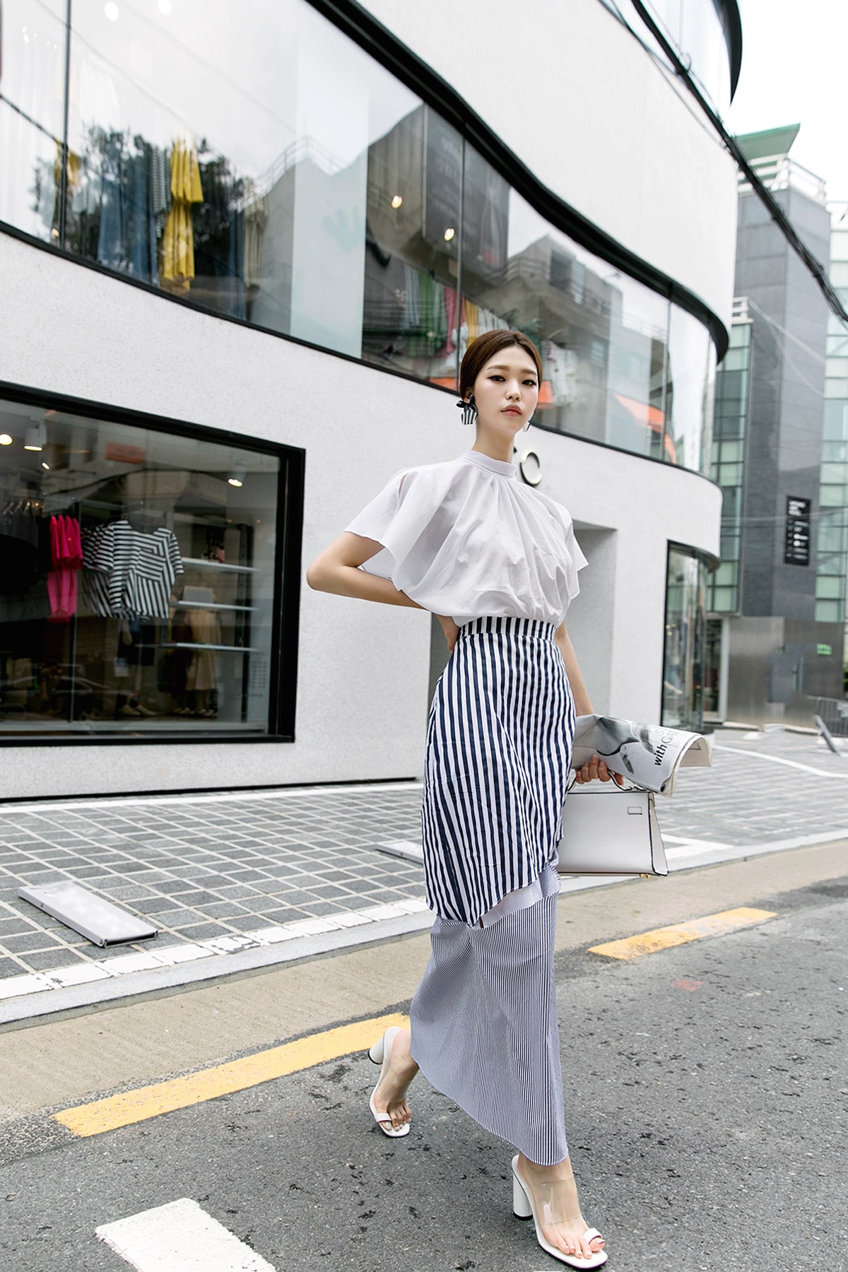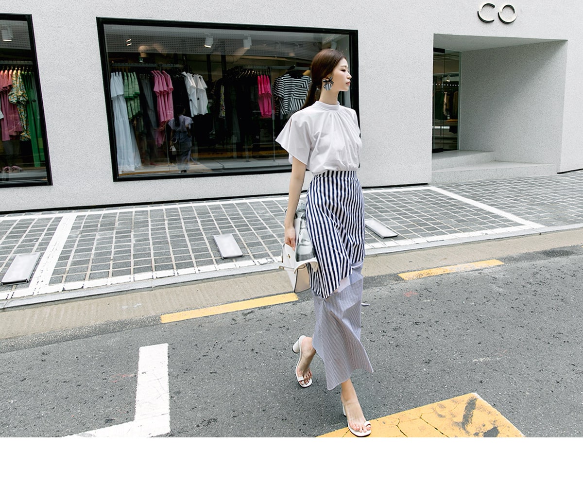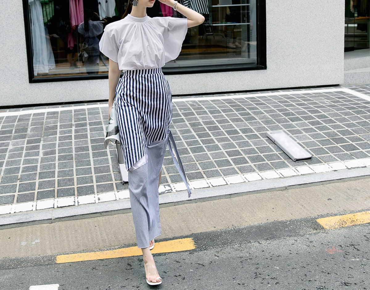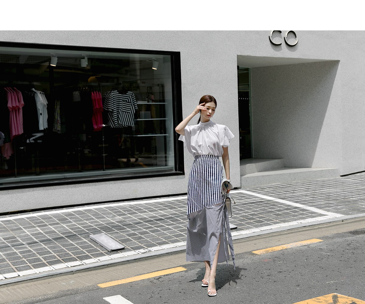 SK1733 스트라이프 레이어링 슬릿 유니크 스커트 Blue mix