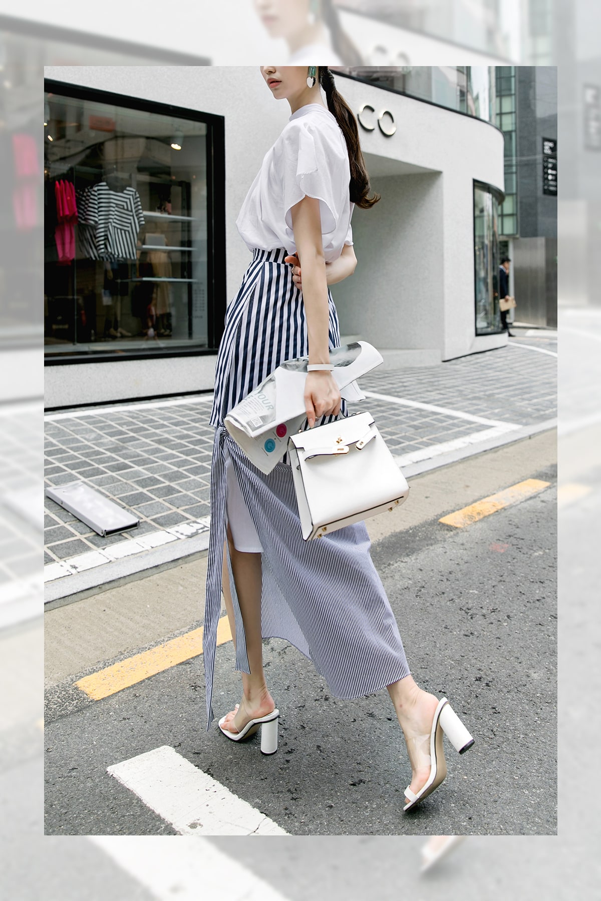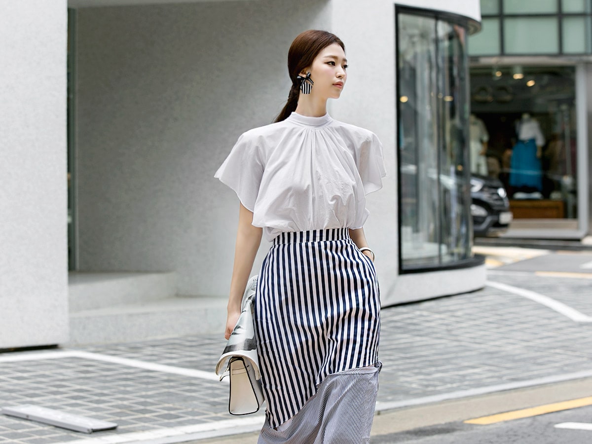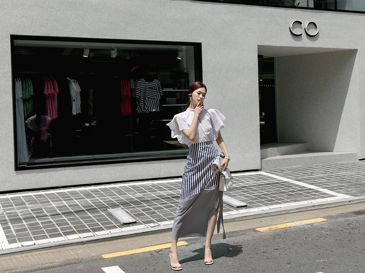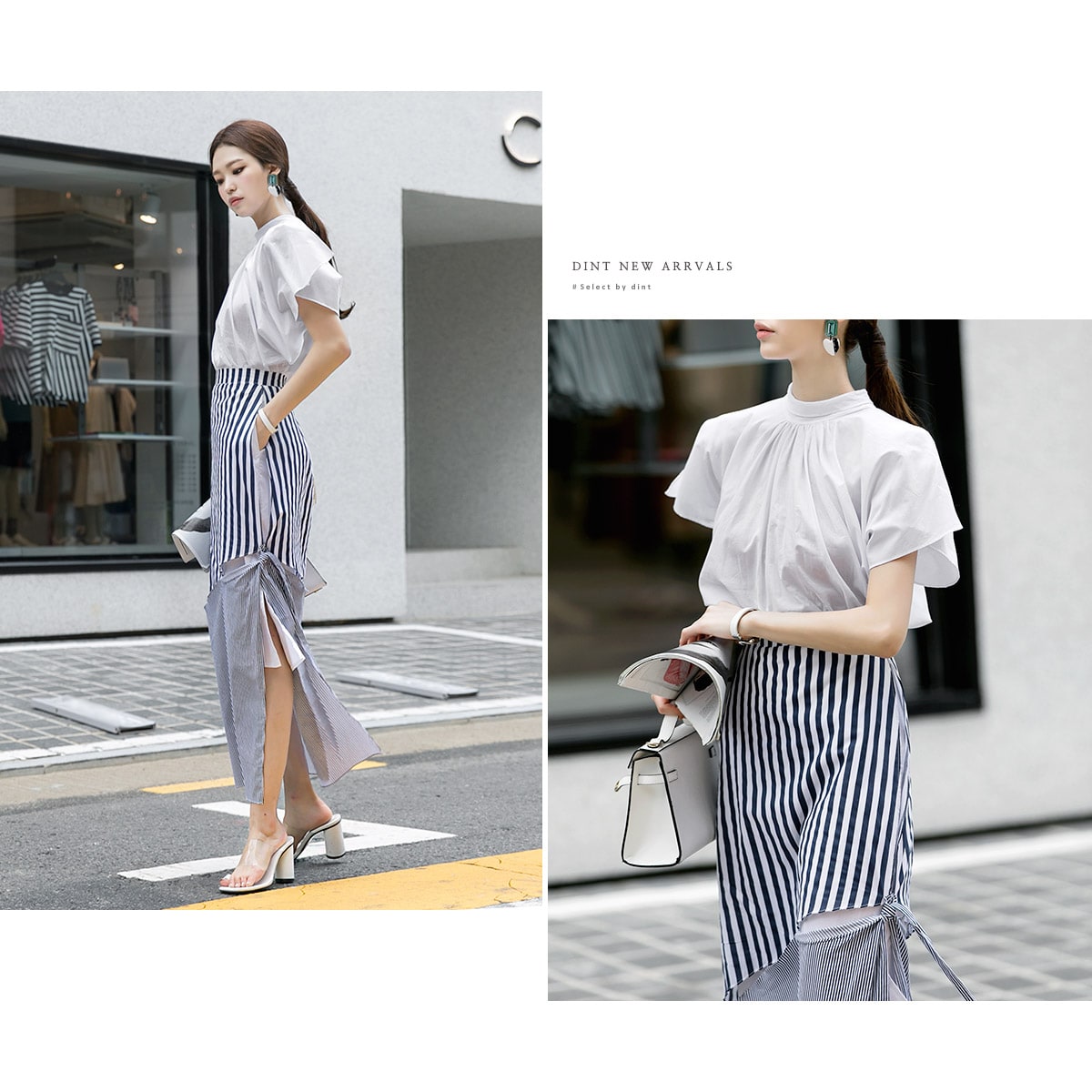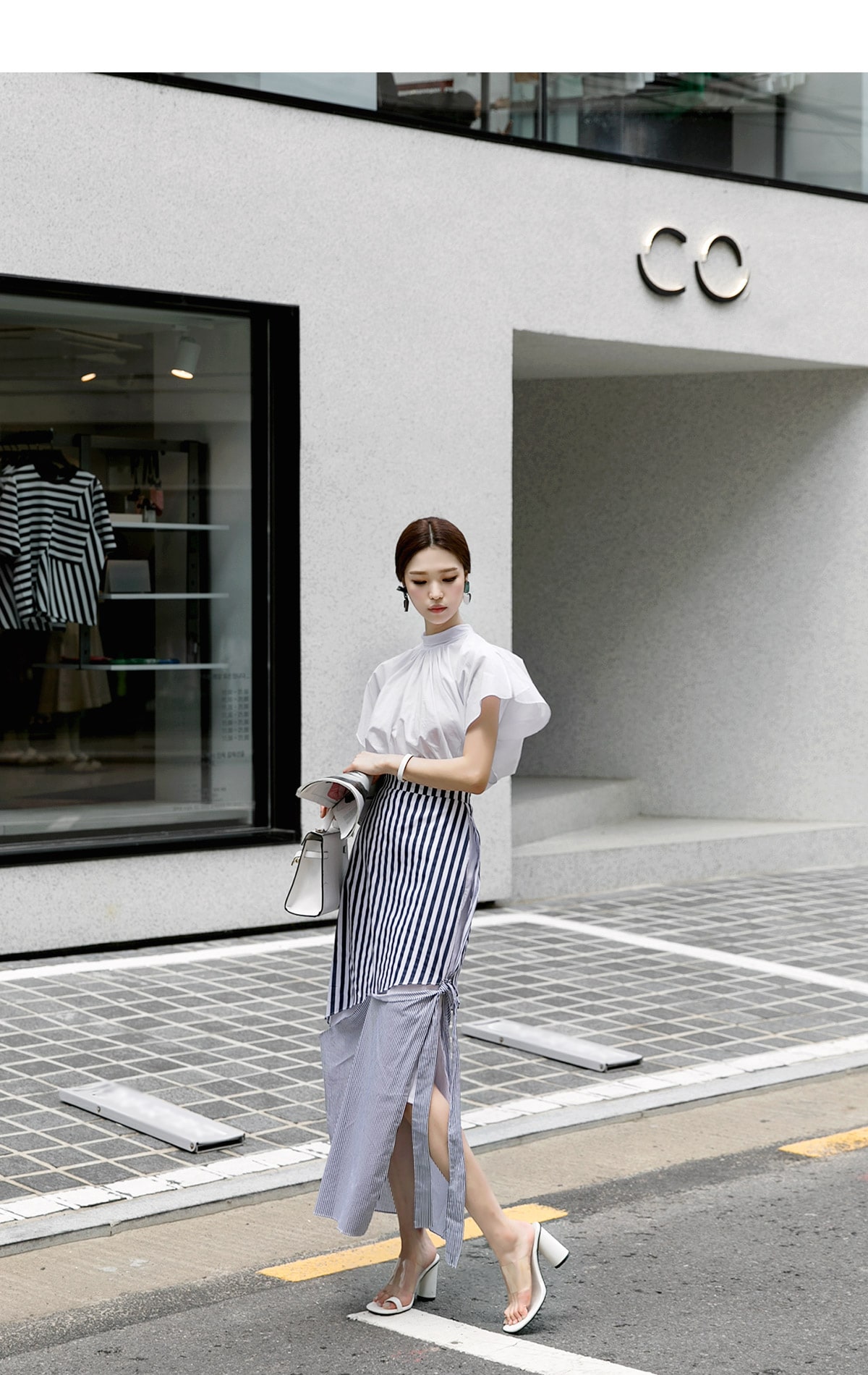 SK1733 스트라이프 레이어링 슬릿 유니크 스커트 Blue mix