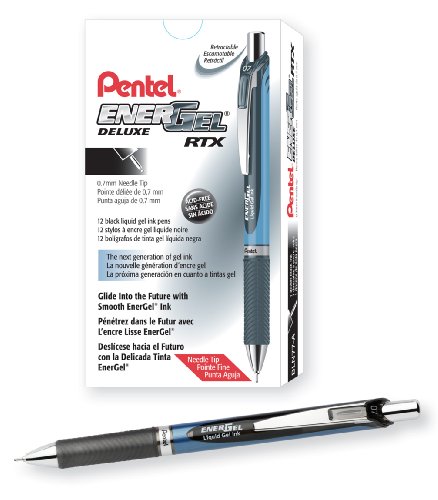 Pentel EnerGel Deluxe RTX Retractable Liquid Gel Pen, Medium Line, Needle Tip, Black Ink, Box of 12 (BLN77-A)
