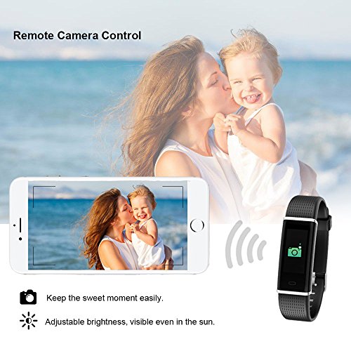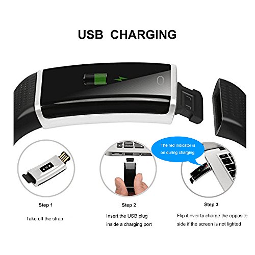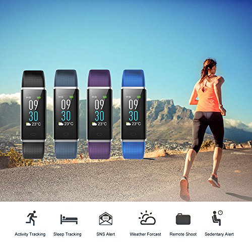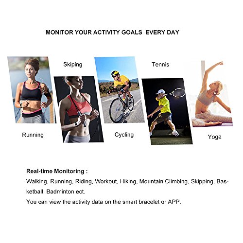 -. Feature : ➢ Stylish & Color Screen Design: Fit wrist from 5.5 to 8 inches.The display screen will be automatically lightened when lift the Wrist,the brightness of the screen can be agjusted on App,with 0.96 inch TFT high sensitive touch color screen you can see the screen clearly even in the sun or in the dark. / ➢ Multiple Function: The Fitness Tracker will track your steps, activities record, heart rate and calories. Supports Call Alert, SMS & SNS Remind, Sedentary Reminder, Date/Time Display,Alarm Clock, Sleeping Monitor, Remote camera shoot. More activity sports Mode, such as walking, running, Fitness, cycling, Yoga, Badminton ect. / ➢ Health Assistant: 24h real-time continuous automatic heart rate monitor ,you can monitor your body health condition at any time. Make sure your skin close to the fitness tracker, otherwise the measure result may be affected (Measurement results are for reference only, not for medical use). / ➢ IP67 Waterproof: Washing hands or getting caught in the rain will not damage your fitness tracker.It's very convenient for different scenes. / ➢ Compatiable System:The smart watch supports most smart phones with Bluetooth 4.0 or above, IOS 7.1 or above, Android 4.4 or above. Full charge requires only about 1 hour and the standby time can be 5-7 days, Easy to charge on PC or any USB port, no extra charging equipments required. we recommend charging your device every few days to ensure you are always tracking.