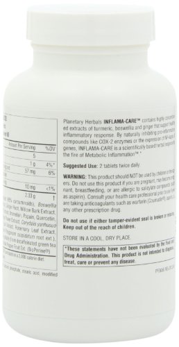 -. Feature : PLANETARY HERBALS inflama-care contains highly concentrated extracts of turmeric, boswellia and ginger that support healthy inflammatory response / The country of origin is United States / PLANETARY HERBALS inflama-care contains highly concentrated extracts of turmeric, boswellia and ginger that support healthy inflammatory response. By naturally inhibiting pro-inflammatory compounds like cox-2 enzymes or the expression of NF-kappa b genes, inflama-care is a scientifically based herbal response to the fire of metabolic inflammation. / Provides a natural herbal response to metabolic inflammation / Inhibits pro-inflammatory compounds such as cox-II and NF-KB / Increases full-body antioxidant activity