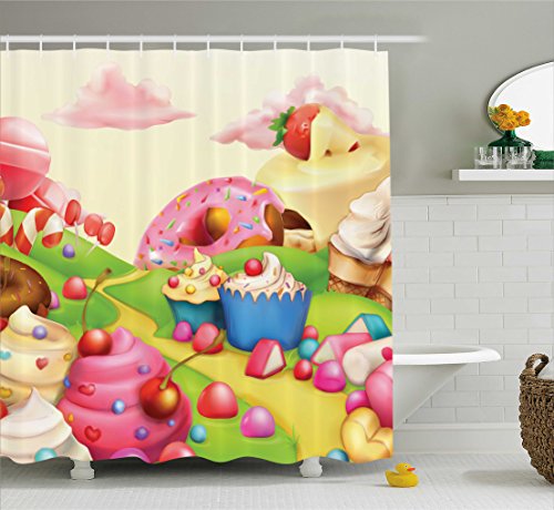 Modern Shower Curtain by Ambesonne, Yummy Donuts Sweet Land Cupcakes Ice Cream Cotton Candy Clouds Kids Nursery Design, Fabric Bathroom Decor Set with Hooks, 70 Inches, Multicolor