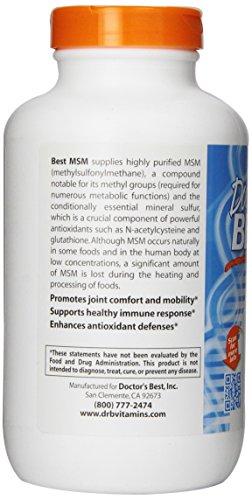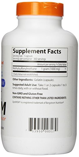 -. Binding : Health and Beauty -. Brand : Doctor's Best -. EAN : 0753950003170 -. Feature : Doctor's Best MSM promotes joint comfort and mobility by helping maintenance of healthy connective tissue / OptiMSM, the source of MSM used in Doctor's Best, is a patented, highly purified form of MSM / MSM helps keep skin, hair and nails healthy by promoting the production of keratin / Doctor's Best MSM is available in tablet, powder, capsule and veggie cap forms supplying 250g to 1500mg MSM per serving / Non-GMO and Gluten Free -. IsAdultProduct : 0 -. Label : Doctor's Best -. Manufacturer : Doctor's Best -. MPN : 753950003170 -. NumberOfItems : 1 -. PackageQuantity : 1 -. PartNumber : 753950003170 -. ProductGroup : Health and Beauty -. ProductTypeName : HEALTH_PERSONAL_CARE -. PublicationDate : 2014-03-01 -. Publisher : Doctor's Best -. ReleaseDate : 2014-02-26 -. Size : 360 -. Studio : Doctor's Best -. Title : Doctor's Best Best MSM Capsules,1000mg, 360 Count -. UPC : 753950003170
