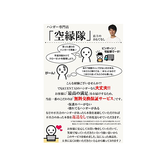 도착한 행거에 보호 캡이나 불편이 있는 행거가 있다.1책의 적은 갯수 (이므로)그래서 교환하고 받는 것도 나쁘군요.이런 경험 없습니다인지(든가)??그렇지만 KUENTAI의 행거라면 괜찮습니다.고객에「최고의 만족」를 배송 하기 위하여,당점 제일의 (엄선)고집은「무료 교환 보증 서비스」입니다.불편의 행거가 있으면 갯수를 연락해 주시면 불편이 있었던 갯수를 반송 없이 다시 한 번 보내게 해 주십니다.※당점에서는 검품하고 나서 출하 하고 있습니다만 책 수가 많은 세트로 판매 하고 있으므로 극히 드물게 불편의 상품이 섞여 버리는 일이 있습니다. 고객으로 안심하고 쇼핑을 해 주시고, 웃는 얼굴로 돌아가 주셨으면 합니다 하는 강한 생각부터 이 서비스를 시작했습니다.마음에 든 상품을,중요로 길게 사주셨으면 합니다 진심으로 바라고 있습니다♪