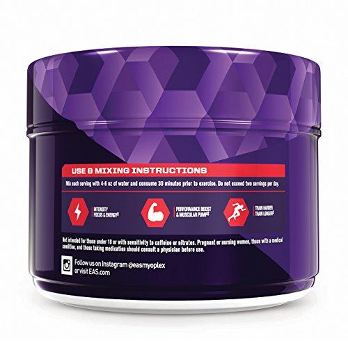 ReleaseDate : 2016-08-16 Studio : EAS, Inc Publisher : EAS, Inc Binding : Health and Beauty Product Description Our EAS Myoplex Pre-Workout Powder is a scientifically formulated power combo for increasing nitric oxide and stamina. And we include beets. Beets are a natural source of nitrate that supports nitric oxide production. Our EAS Myoplex Pre-Workout provides 5 grams of beetroot extract per serving (10 grams per two servings) so you can train harder and longer. Recommended use is two servings mixed with 8-10 ounces of water. 0