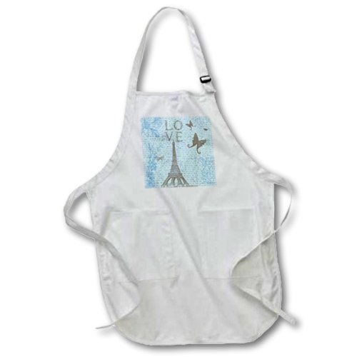 3dRose apr_152139_2 Love Eiffel Tower Blue Script and Butterflies Medium Length Apron with Pouch Pockets, 22 by 24-Inch