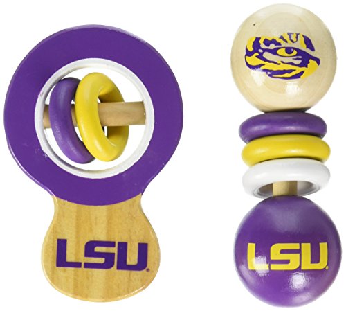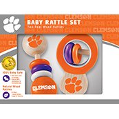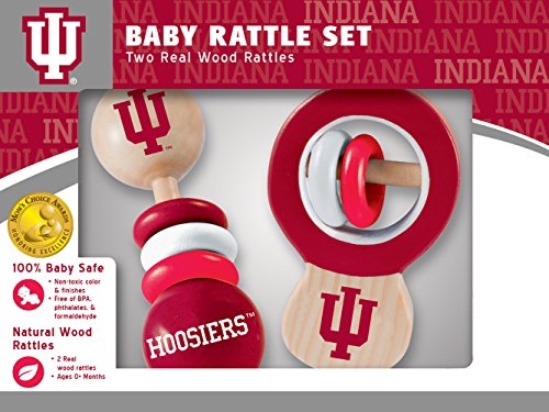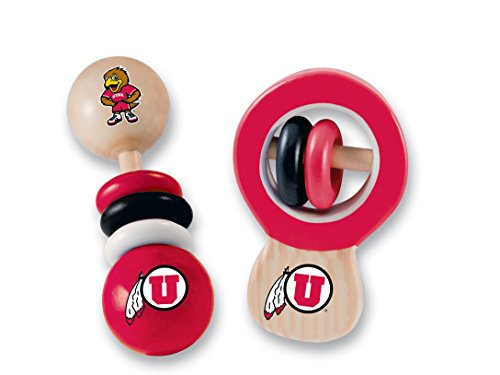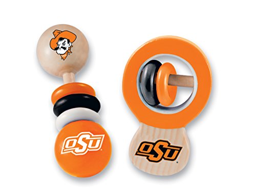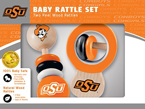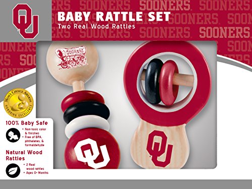This set of two Oklahoma state rattles is designed to make it easy for small baby hands to play with. Baby-friendly products help your little bears fan grow healthy and happy. Growth & development toys offer co-play fun, tactile play, and sensorimotor skills. Show baby how to shake the rattles to make noise. Your smile encourages baby to keep playing as you teach them new skills. Help baby develop grasping and fine motor skills. Knobs, handles, and rings offer various shapes for baby to explore. Baby discovers cause-and-effect of movement making sound. Rings shake against each other to create rattle sounds. Real wood rattles are 100% baby safe made with real wood, non-toxic colors & finishes, and free of BPA, phthalates, & Formaldehyde.Feature