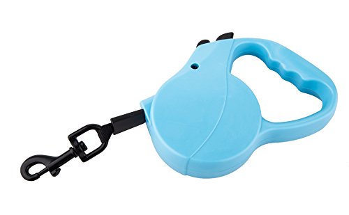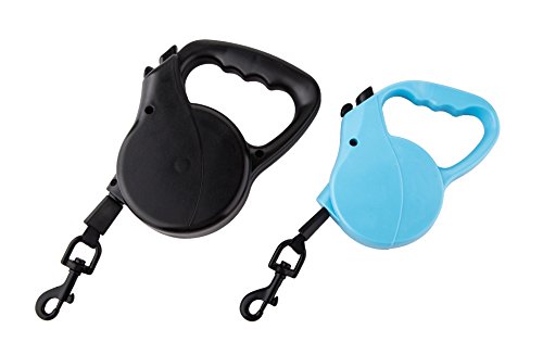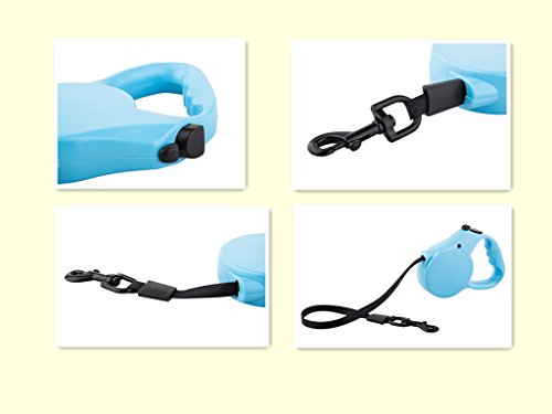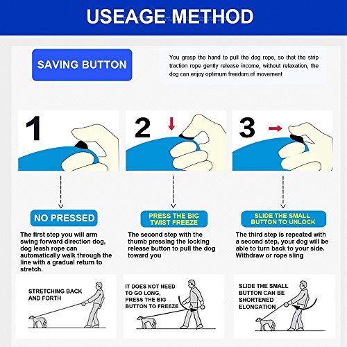 Information: Color: Black and Blue Weight: Size M-7.9 ounces; Size S-5.6 ounces Rope material: Nylon leash; ABS plastic handle; alloy hook Adjustable length: Size M-extends up to 10ft; Size S- extends up to 10ft Size: M, supports up to 55 pounds-heavy duty Size: S, supports up to 33 pounds-heavy duty Features: 1.The ergonomic comfortable and anti-slip handle is easy safe to grip. 2.Easy control leash length - the reliable lock button gives you full control on enabling instant retraction of your dog when needed. 3.Reflective stickers and neon-colored components for better visibility Reflective 10 ft and 15 ft cord leash that helps increase safety for dogs and their owners,offers plenty of freedom of movement Lightweight, compact leash for dogs up to 33 lbs and 55 lbs Methods of use: 1. Be sure you have your pet under control before attempting to attach the retractable leach. 2. Fasten the leash hook onto the metal loop of your pets collar. 3. When leash is at a desired length, push the small top black button in with you thumb. This will cause the leash to lock. To release, press the large black button down. To temporarily hold your once released the leash will then begin to retract. 4. If the retractable leash separates itself from your dog's collar during use, immediately turn your face away and instantly apply the brake button. Warning: The dog leash is used to walk the dog, please prevent your dog from biting the rope. By the way, please do not used it to tie a dog. clean up the mess your pooch leaves on those untimely occasions. 0
