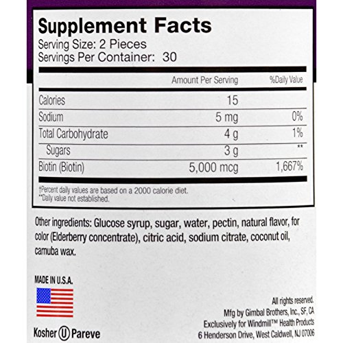 -. Title : Windmill Health Products Biotin 200 mcg with Pectin - 60 Gummies - For Young looking Skin - Gluten Free - For Beautiful Hair, Skin and Nails